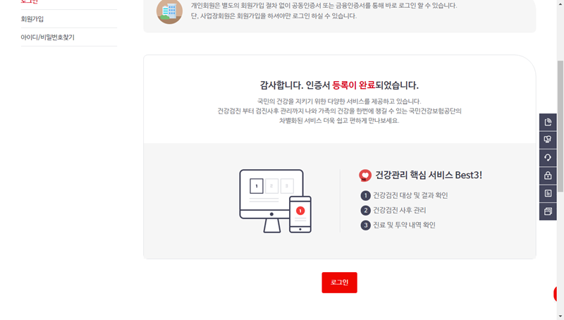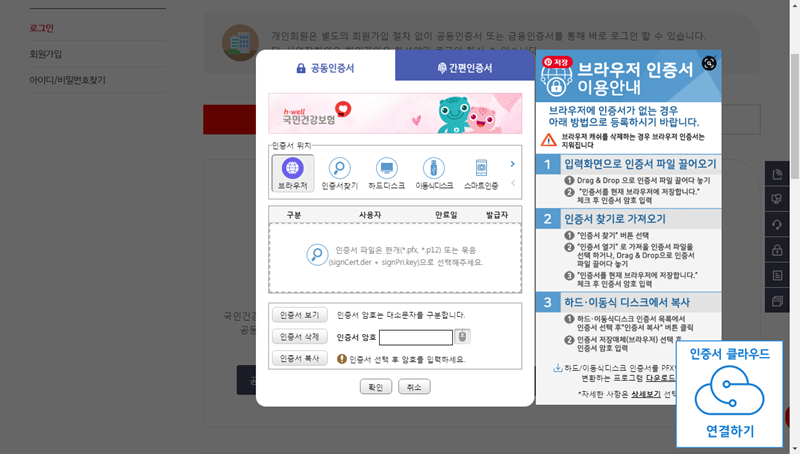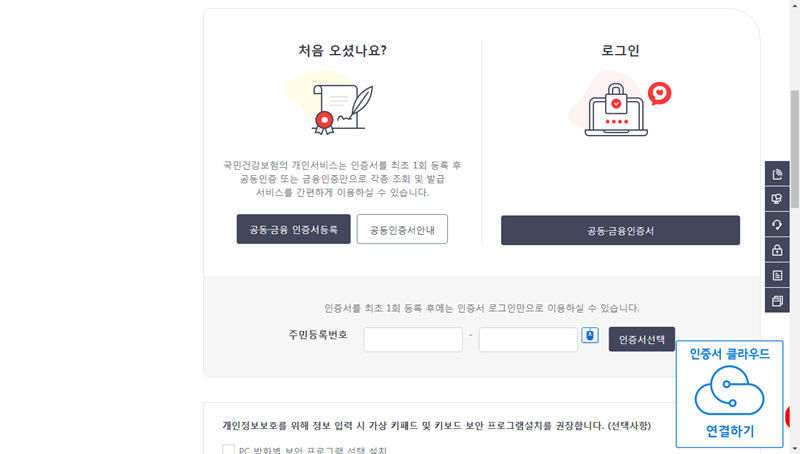 ※만약 인증서 갱신이나 변경 하셨다면, 「처음 오셨나요?」 항목에서 공동/금융 인증서 등록 하신 후 다시 진행하실 수 있어요.