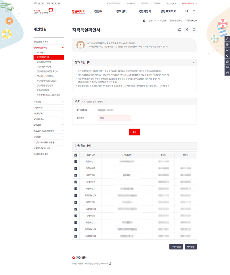 3. 로그인 하셨으면 다시 ▲자격득실 확인서 발급 버튼을 선택하신 후, 자격득실확인서 페이지로 이동하시면 바로 직장가입/지역가입/지역세대주/지역세대원/직장피부양자 등 국민건강보험의 자격득실 관련 내용을 확인해 보실 수 있습니다.