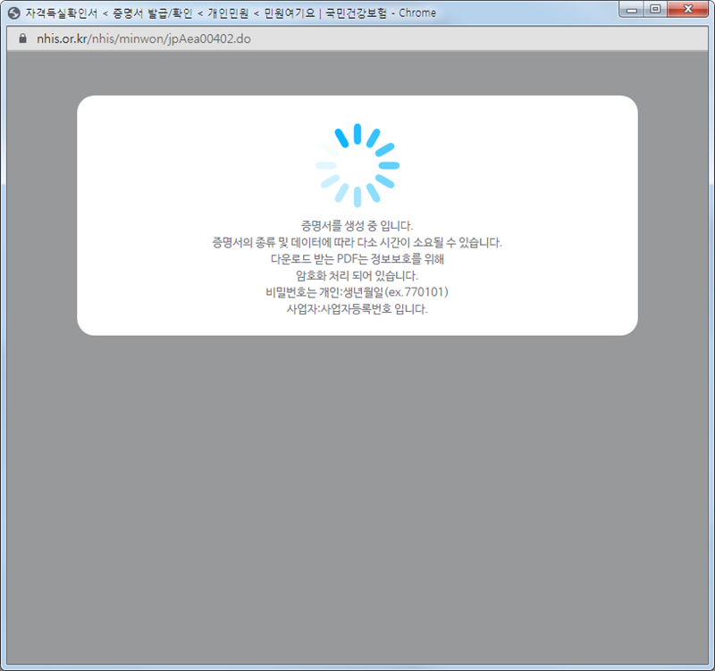 ※주민번호 변경이나 이름이 변경 된 경우, 국민건강보험공단 중 가까운 지사에 문의하셔야 하구요. 일일 발급 횟수도 20회로 제한 되어있으니 초과했을 때 역시 고객센터(1577-1000) 나 지사를 통하셔야 합니다.