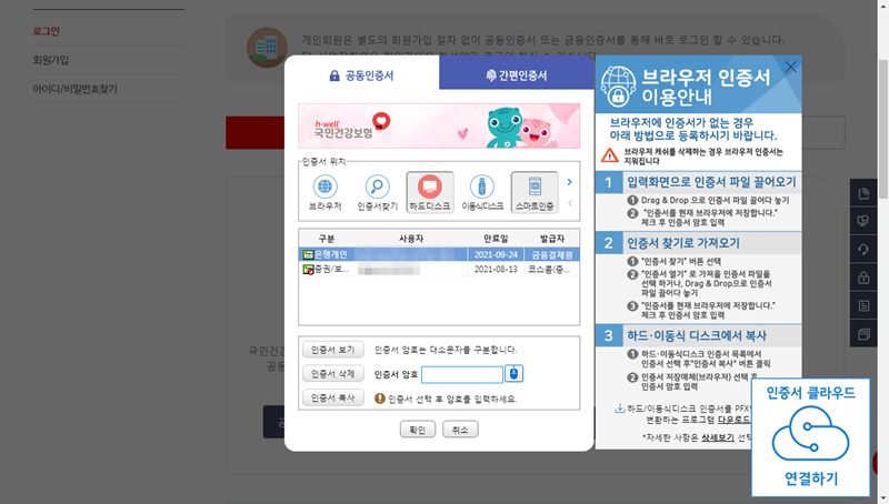 ※만약 인증서 갱신이나 변경 하셨다면, 「처음 오셨나요?」 항목에서 공동/금융 인증서 등록 하신 후 다시 진행하실 수 있어요.