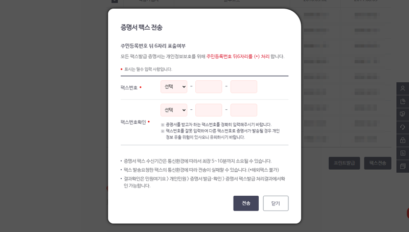5. 그리고, 팩스 전송은 간단하게 팩스 번호 입력 후 하실 수 있지만, 잘못된 번호로 입력 했을 때에 정보 유출 위험이 있으므로 팩스번호를 꼼꼼하게 살피셔야 합니다. 전송결과는 민원여기요 > 개인민원 > 증명서 발급 확인 > 증명서 팩스 발급 처리결과 페이지에서 확인하실 수 있습니다.