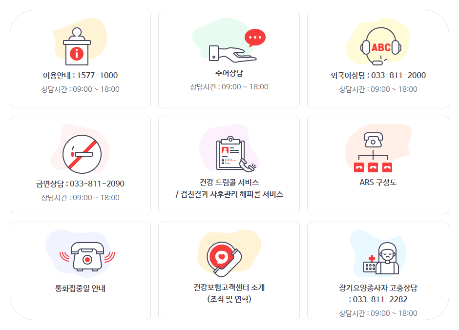 수어상담, 금연상담, 건강드림콜서비스 등은 고객센터 페이지에서 더 상세하게 확인하실 수 있습니다.