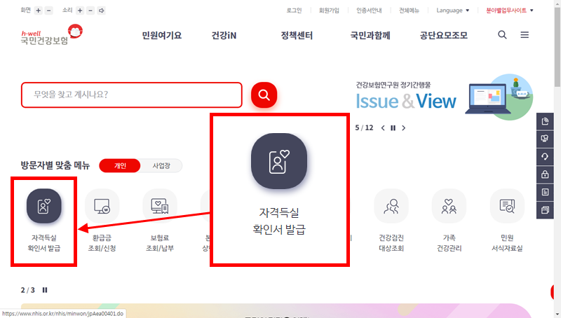 1. 건강보험 홈페이지에 접속 하신 후, 개인 방문자별 맞춤 메뉴 중 ▲자격득실 확인서 발급 버튼을 선택해 주시면 되구요.